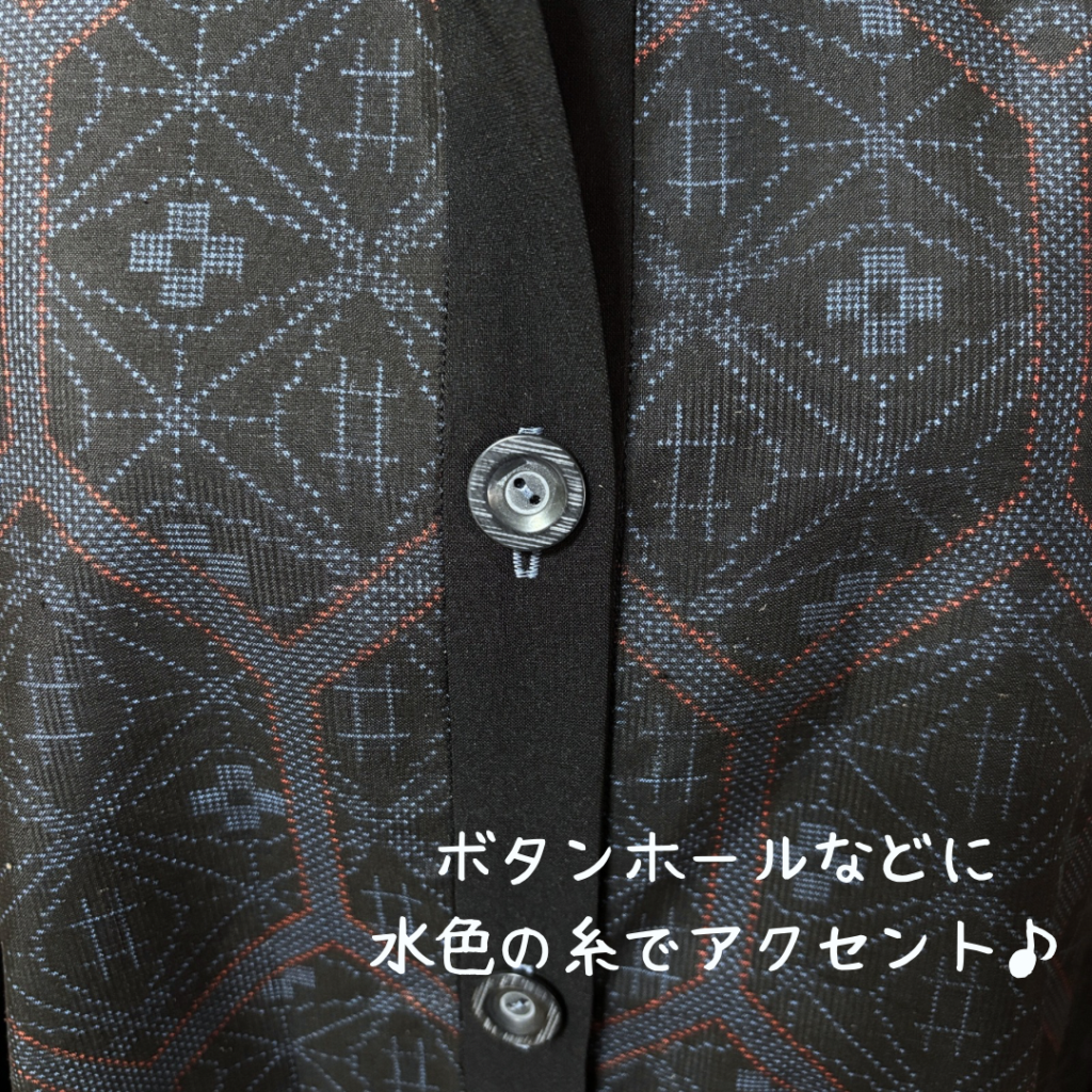 アクセントカラーに着物柄と同色の水色の糸を使用しています。