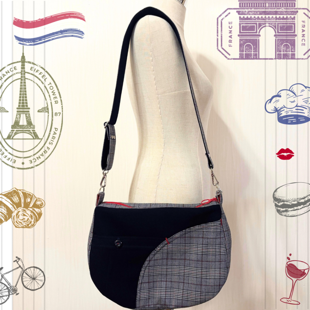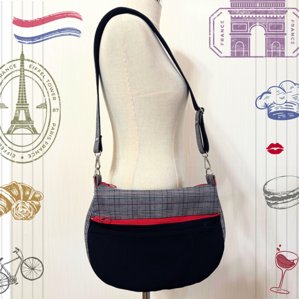 お客様のご希望を伺いつつ、デザインに取り入れたい布を選んでいただいたのですが、他の色と悩みつつ赤いラインの入ったグレーベースのチェックを選択。