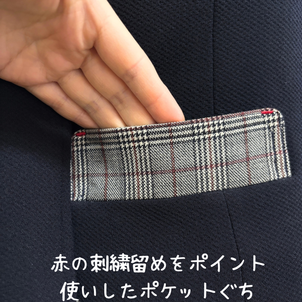 右側のチェックのポケットにも赤い留め刺繍をポイントに採用。